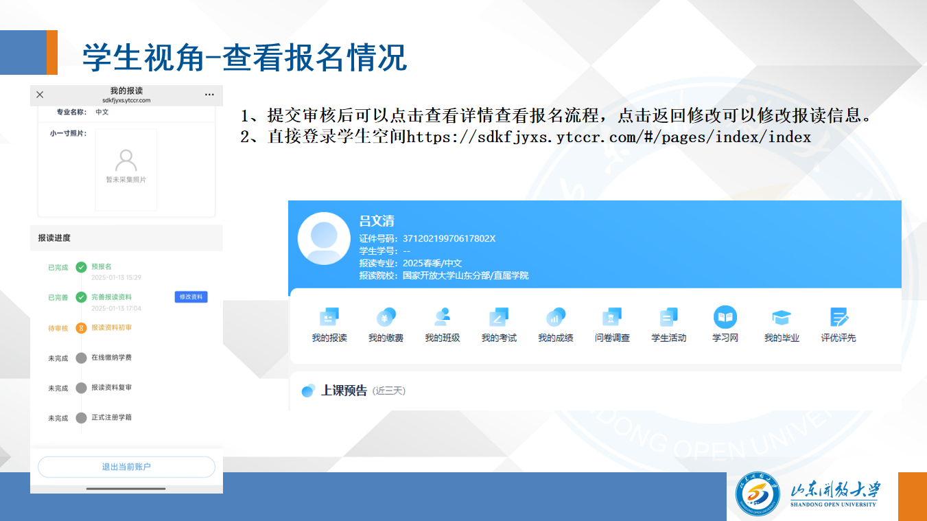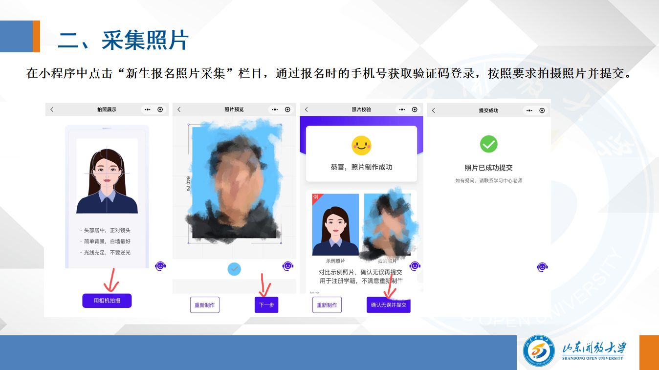 二、报名资料包括:2寸蓝底高清电子照、身份证正反面扫描件、毕业证扫描件; 报考本科的需同时提交学信网查询的电子注册备案表,手持身份证合影;省外户籍提供济南的居住证或社保证明、在省校门口和招生老师的合影 。